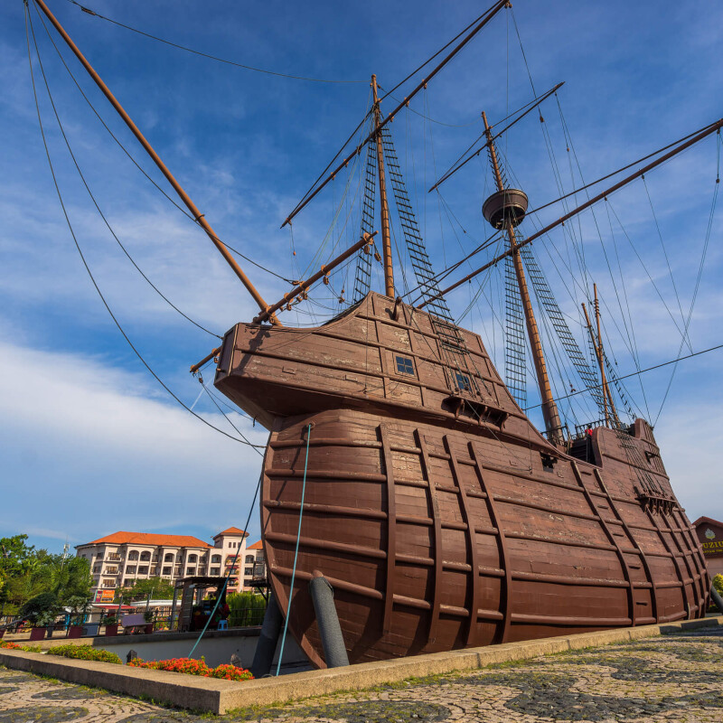 Located at Jalan Merdeka, the museum’s replica of Flor de la Mar is an imposing structure, measuring 34 meters high, 36 meters long, and 8 meters wide. The life-size 16th-century Portuguese man-of-war serves as a gateway to Malacca’s maritime legacy, including the golden era of the Malacca Sultanate, when the city was celebrated as the “Emporium of the East.”